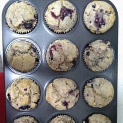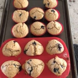 The main reason I spent so much effort in developing this recipe is for school lunches. I wanted something I could put in their lunches boxes they would like that had healthy carbs and fruit and no sugar. In their lunch boxes, I just put these clean blueberry muffins, some cooked uncured bacon, and their favorite vegetable. That gets a carb, protein, fruit, and vegetable and they love this lunch.