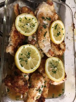 This recipe has a simple breading and after it's all golden brown, you make a quick lemon sauce right in the pan. Make some extra sauce to put over noodles, cauliflower or the carb of your choice.