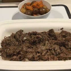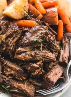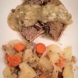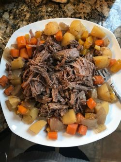 This is a simple meal; it is simply a chuck roast with potatoes and carrots with a sauce over it.