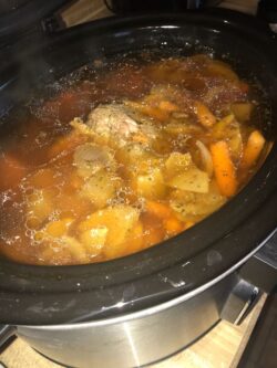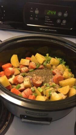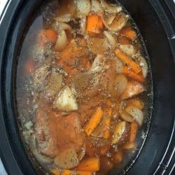 Last night , I prepped all the ingredients and put them inside the crockpot overnight in the refrigerator. This morning I turned it on low for about seven hours and it turned out delicious. The only thing I would change is to add a little more potatoes and a little more carrots. I did sprinkle it with a little kosher salt ( just a bit) and added this seasoning found in the Latin section called Adobe seasoning after I cooked it. oh, my no left overs.