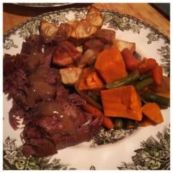 This recipe is extremely easy and the gravy is delicious because you use the drippings that have been cooking all day with the roast in the crockpot. This recipe is totally customizable too. I used russet potatoes, but it is also good with any kind of potato, like red, sweet, fingerling, etc. or you can mix it up and use something like parsnips to make it Paleo. Cut the vegetables in big chunks to keep them from getting super mushy.
